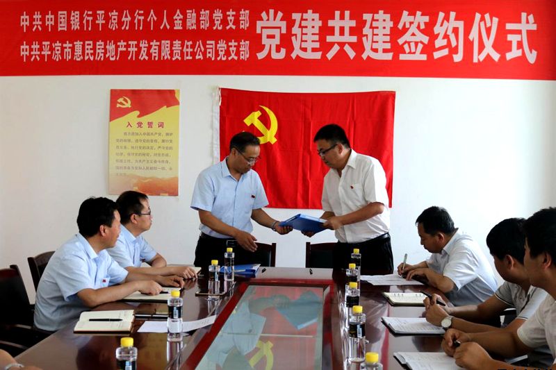 近日,中共平?jīng)鍪谢菝穹康禺a(chǎn)開發(fā)有限責(zé)任公司黨支部與中共中國銀行平?jīng)龇中袀€人金融部黨支部黨建共建簽約儀式在中國銀行平?jīng)龇中信e行。惠民投資公司副總經(jīng)理柳振源、中國銀行平?jīng)龇中屑o(jì)檢書記秦建鋼、副行長楊震榮出席簽約儀式。