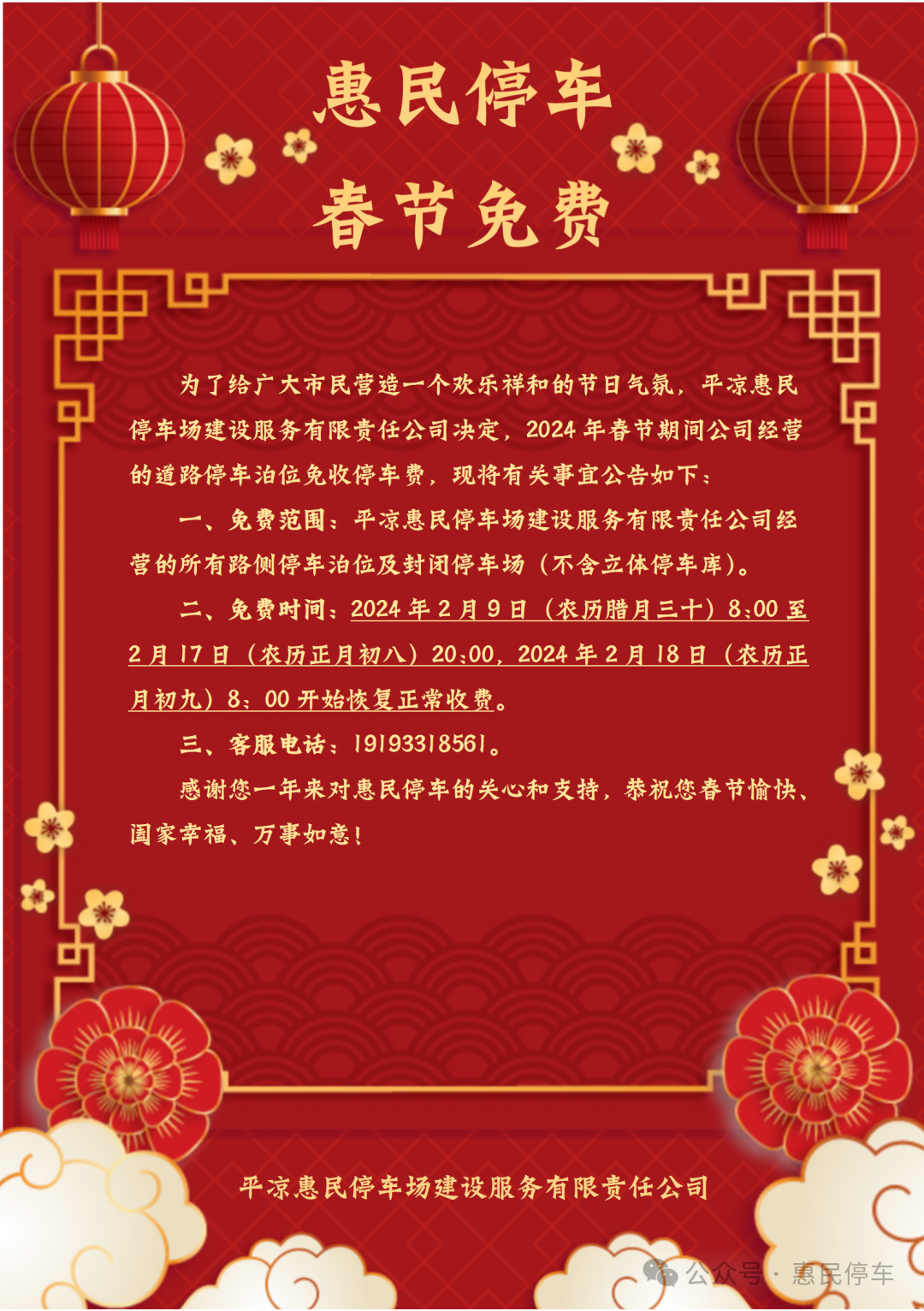 春節(jié)長(zhǎng)假期間(除夕至正月初八),惠民停車場(chǎng)公司免費(fèi)開放了城區(qū)經(jīng)營(yíng)范圍內(nèi)的24處封閉式停車場(chǎng)和全部路側(cè)停車泊位,為市民和游客提供便利,助力營(yíng)造歡樂祥和的春節(jié)氛圍。