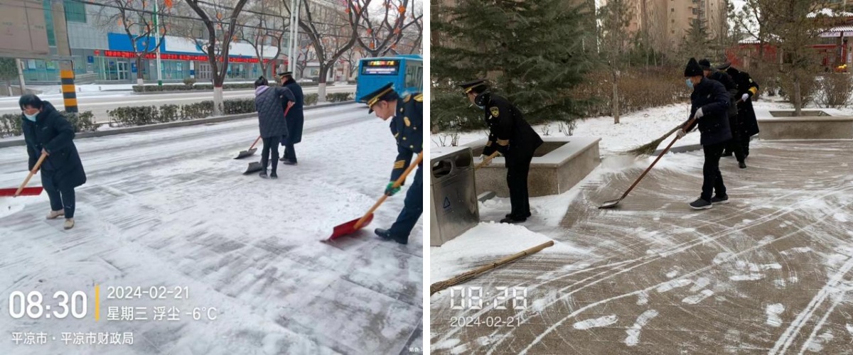 2月21日清晨,平?jīng)鲑e館全體職工就立刻奔赴各自負責的“戰(zhàn)場”,開展掃雪工作。大家不畏寒冷,拿起鐵鍬、掃帚等除雪工具,迅速開展清雪活動,及時消除道路安全隱患,為客人出行保駕護航。