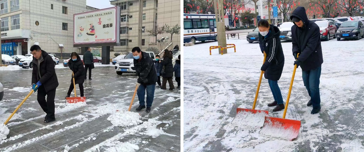 文化傳媒公司全體員工快速開展鏟雪除冰工作,將劇院外圍平臺、人行步道、車輛出入口、廣場等處的積雪進行了清掃。全體員工不畏嚴寒、干勁十足,用最短的時間為市民清理出了“安全通道”。