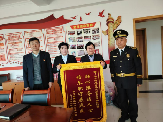 近日,中行家屬院業(yè)委管理人員來到惠城物業(yè)物業(yè)站,贈送“貼心服務暖人心,恪盡職守展風采”錦旗。
