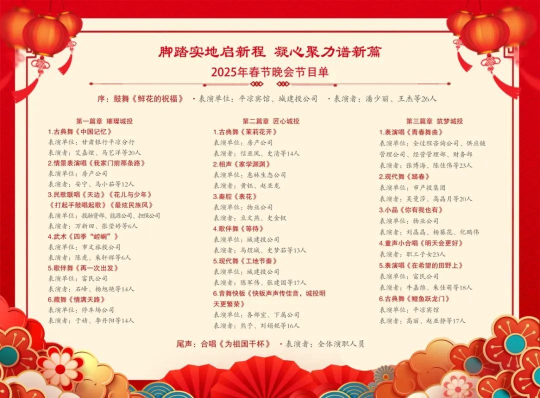 節(jié)目由集團(tuán)公司各部室、下屬各公司精心編排,邀請甘肅銀行平?jīng)龇中小⑹挟a(chǎn)投、市文旅投公司傾情助演,全面展示了集團(tuán)公司在深化改革、轉(zhuǎn)型發(fā)展中取得的輝煌成就以及干部職工勇?lián)姑?、奮勇爭先、攻堅克難、真抓實(shí)干、昂揚(yáng)向上的精神風(fēng)貌。