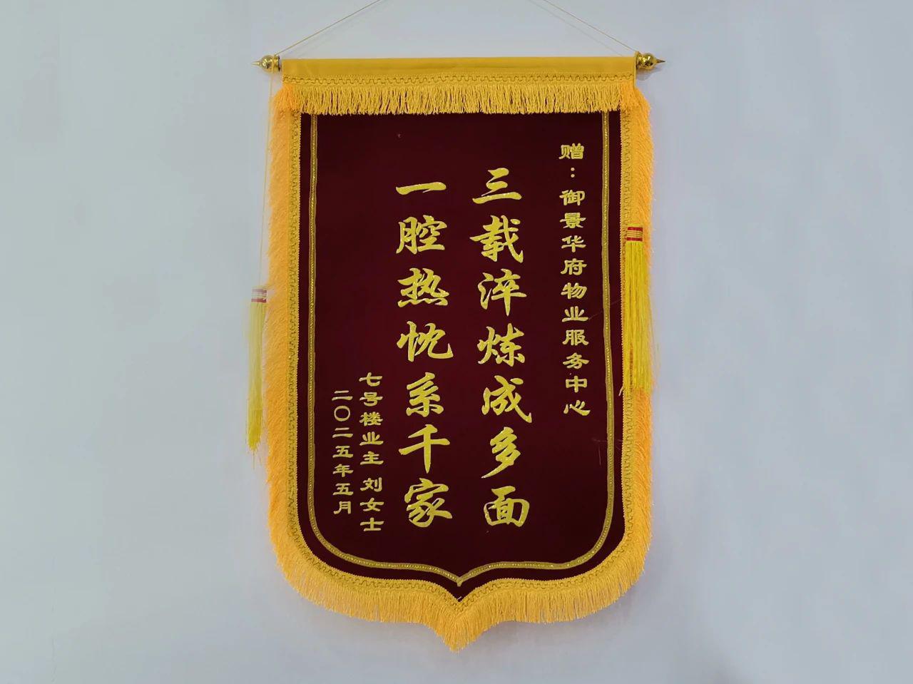 5月26日,御景華府小區(qū)業(yè)主劉女士向物業(yè)服務中心贈送了一面繡有“三載淬煉成多面,一腔熱忱系千家”的錦旗,并附上一封感謝信。