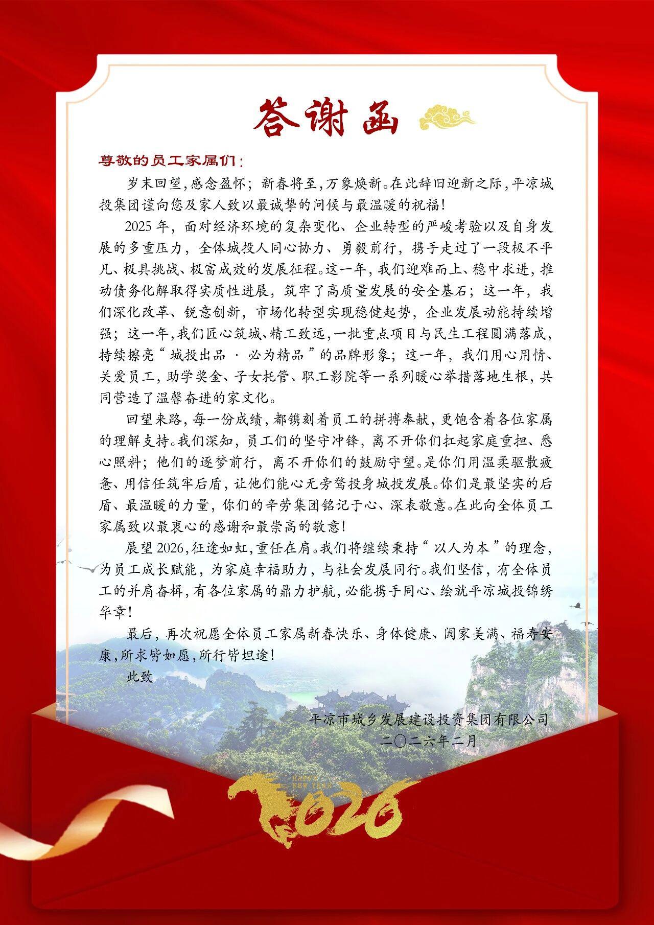 會上,集團公司向職工家屬代表們送上答謝函。集團公司黨委主要領(lǐng)導(dǎo)向職工家屬代表們?nèi)娼榻B了過去一年集團公司改革發(fā)展成就和2026年發(fā)展思路、重點,并與他們親切交談,向他們送去衷心的感謝和新春的祝福。參會家屬代表們對集團公司在平?jīng)龀鞘薪ㄔO(shè)、民生改善等方面作出的卓越貢獻給予高度評價,表達了對集團的美好祝愿,并表示將一如既往地做職工最堅實的后盾,主動分擔(dān)家庭責(zé)任,讓親人能卸下后顧之憂,全身心投入工作,為集團公司改革發(fā)展貢獻更多的力量。