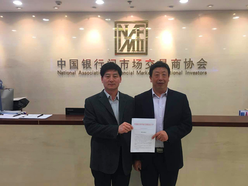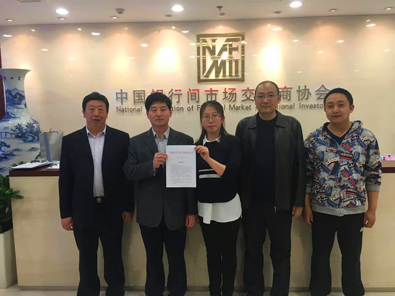 副總經(jīng)魏顯文(左二)和融資部、財務部部長王國太(左一)成功領取中國銀行間市場交易商協(xié)會非公開定向債務融資工具注冊通知書