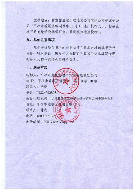 繳納地點(diǎn):甘肅鑫盛達(dá)工程造價(jià)咨詢有限公司平?jīng)龇止荆ㄆ經(jīng)鍪嗅轻紖^(qū)柳湖西路13號(hào))(注:投標(biāo)人于開標(biāo)截止期三日前繳納投標(biāo)保證金,否則視為無(wú)效投標(biāo))。