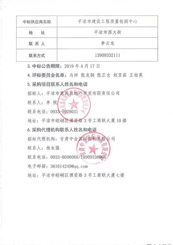 平?jīng)鍪杏叭A府商品房建設(shè)項(xiàng)目工程檢測(cè)服務(wù)項(xiàng)目中標(biāo)公告