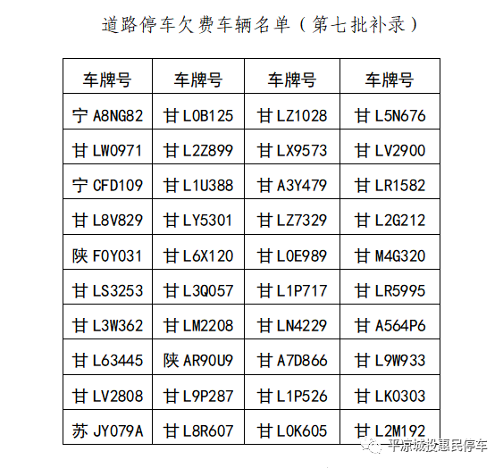為了維護公平、公正、良好的停車秩序,我公司對第七批路側(cè)停車欠費車輛信息公示進行補錄,請各位車主于2022年3月1日前及時補繳所欠停車費;逾期未補繳的,公司將車輛信息報送“信用崆峒”平臺公示;并依法起訴逾期仍未繳清欠費的車主。