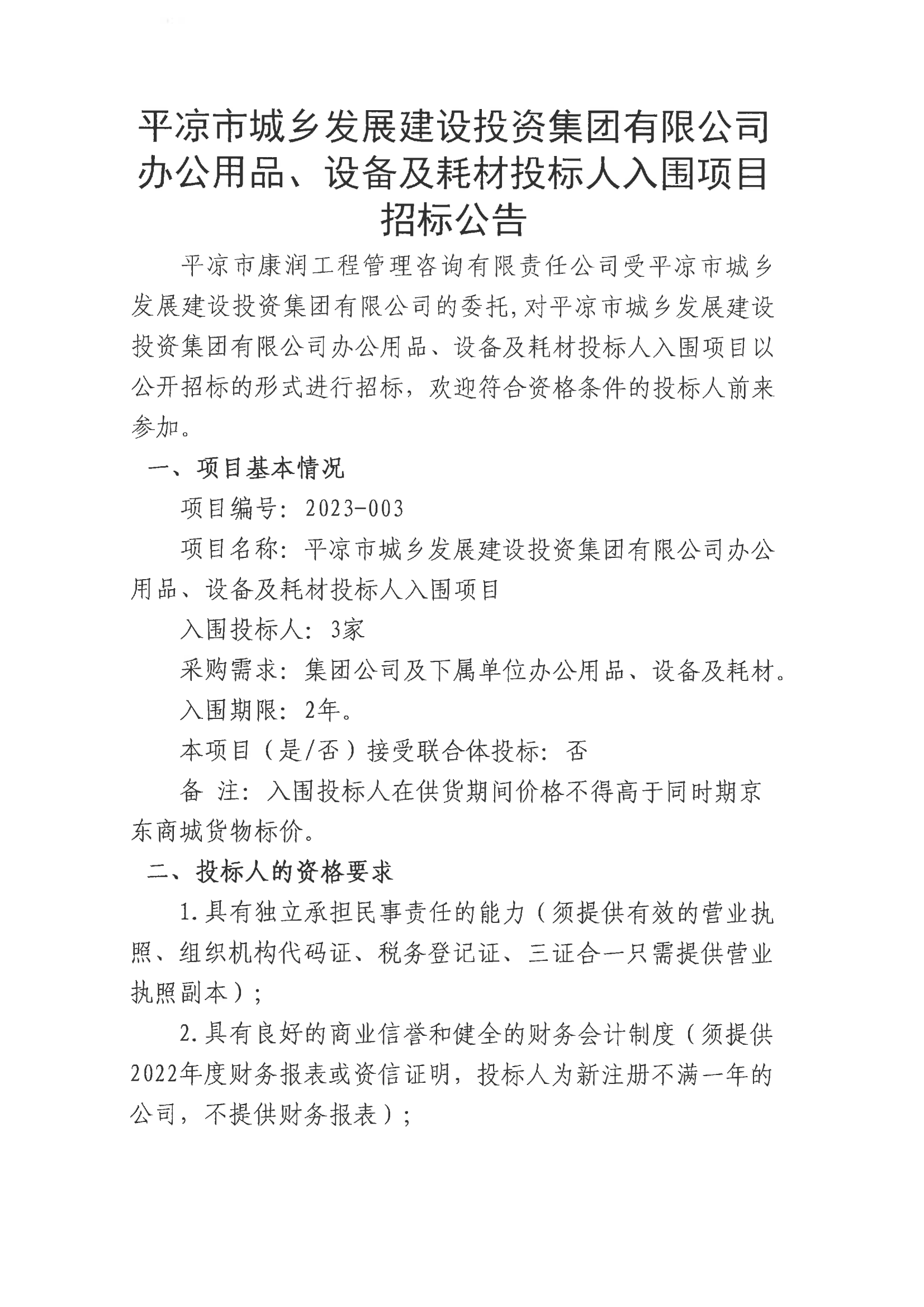 辦公用品、設備及耗材投標人入圍項目招標公告